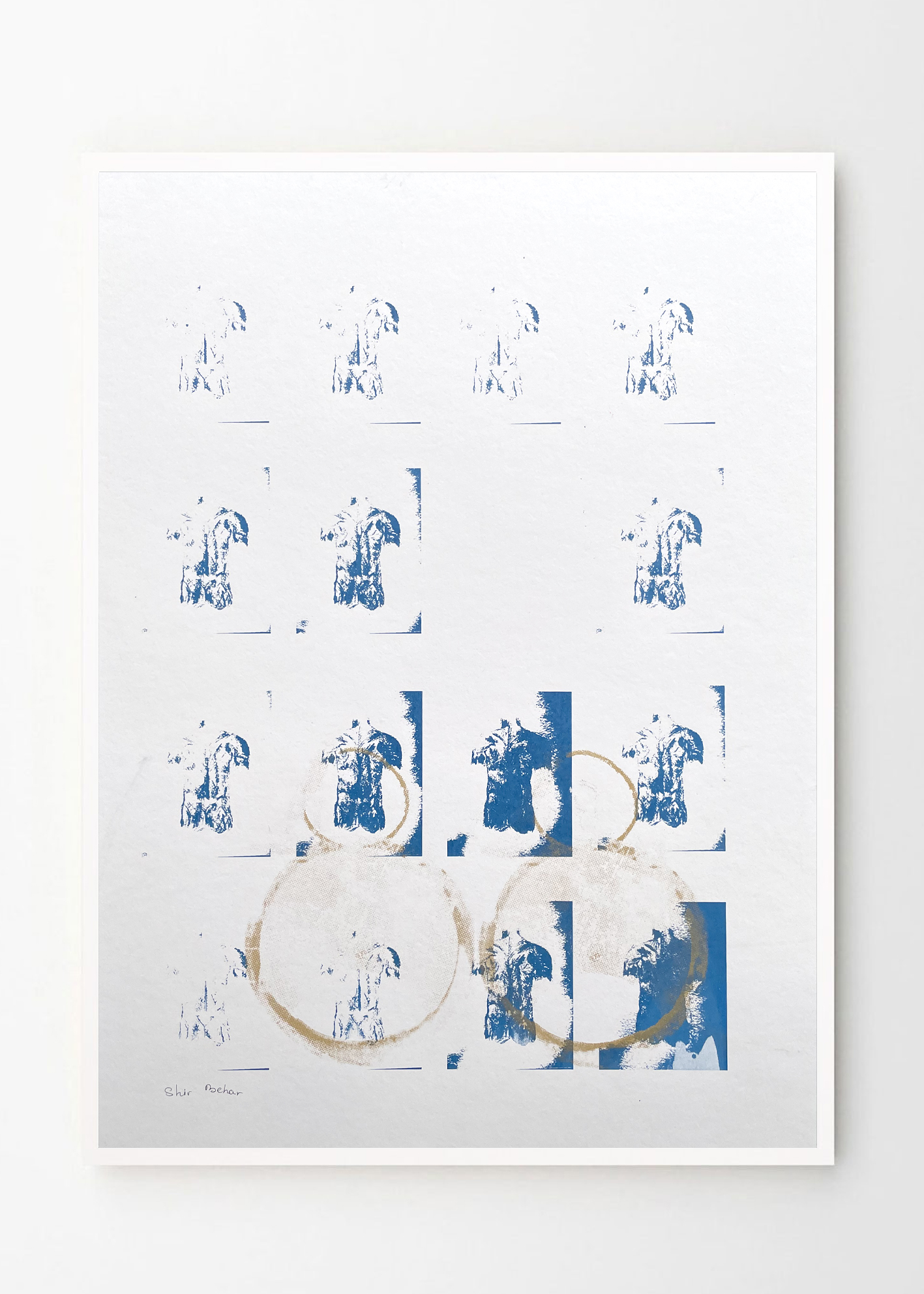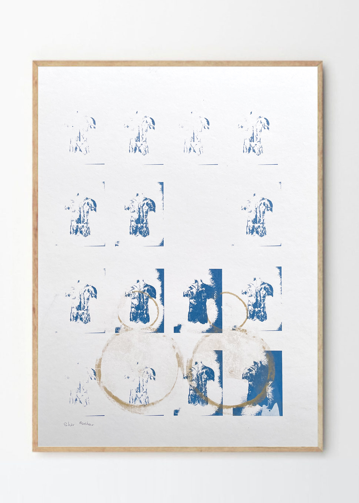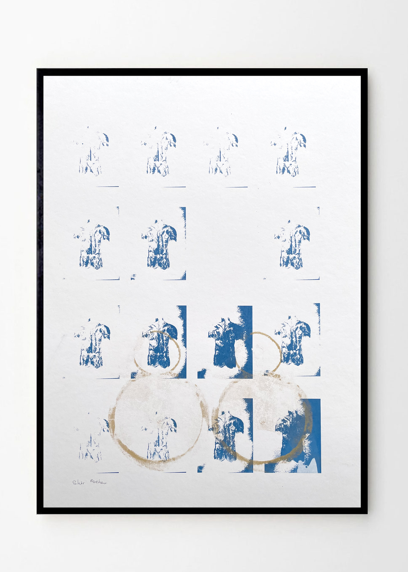 My print comes from drawing a man's torso. I adapted the drawing to reflect the simplicity and power of the human form. I created the print by hand printing, when I used a deep blue color, which created the dramatic emphasis on the figure. The manual process, in which each step is done carefully, adds to each print a quality of personal artistic work and connects me to every detail of the image, from the initial sketch to the last touch of color.