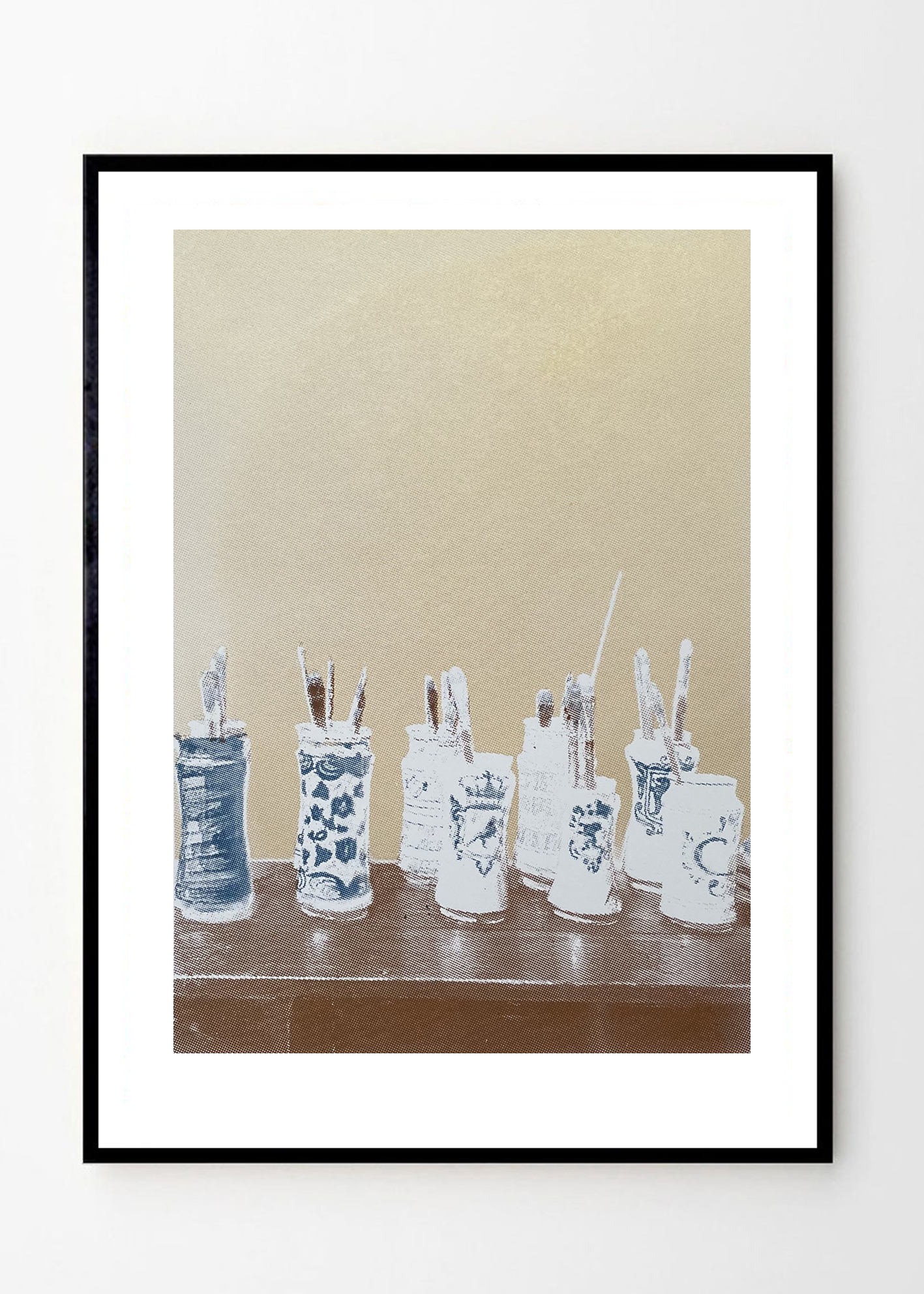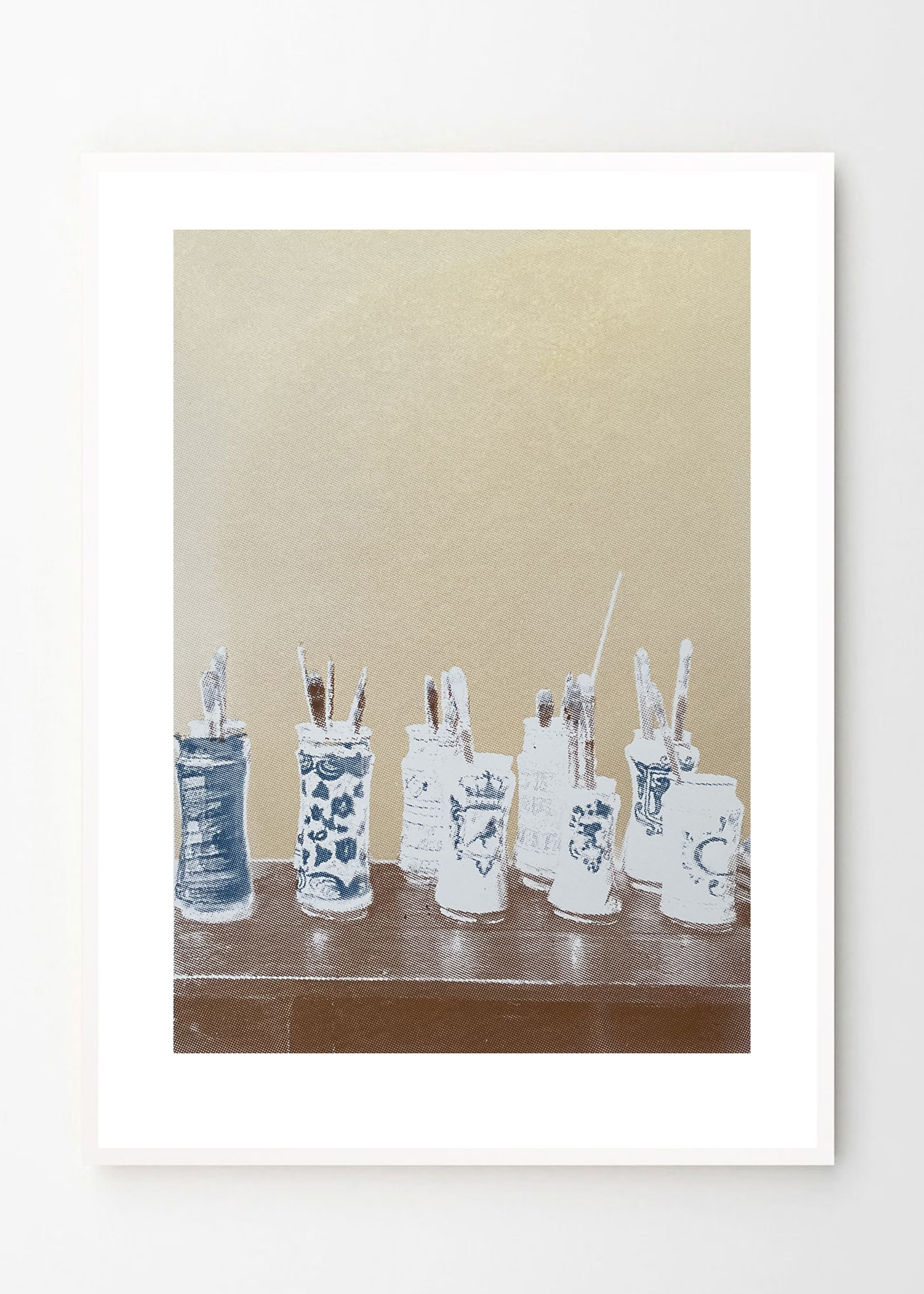 הדפס רשת Sorolla's Pallete – מכחולים בכדי קרמיקה בצבעי זהב, כחול ולבן. בהשראת בית סורולה במדריד.