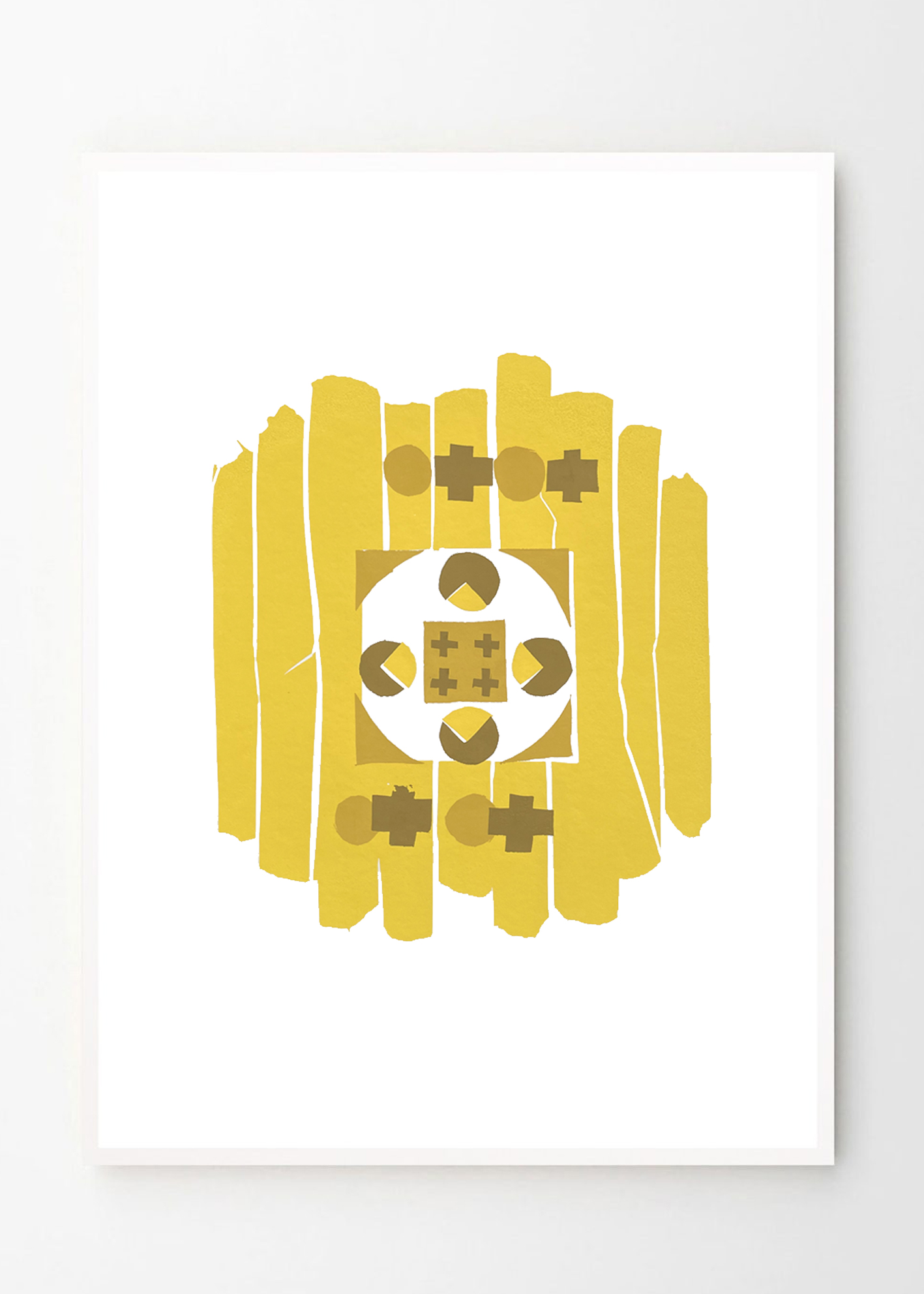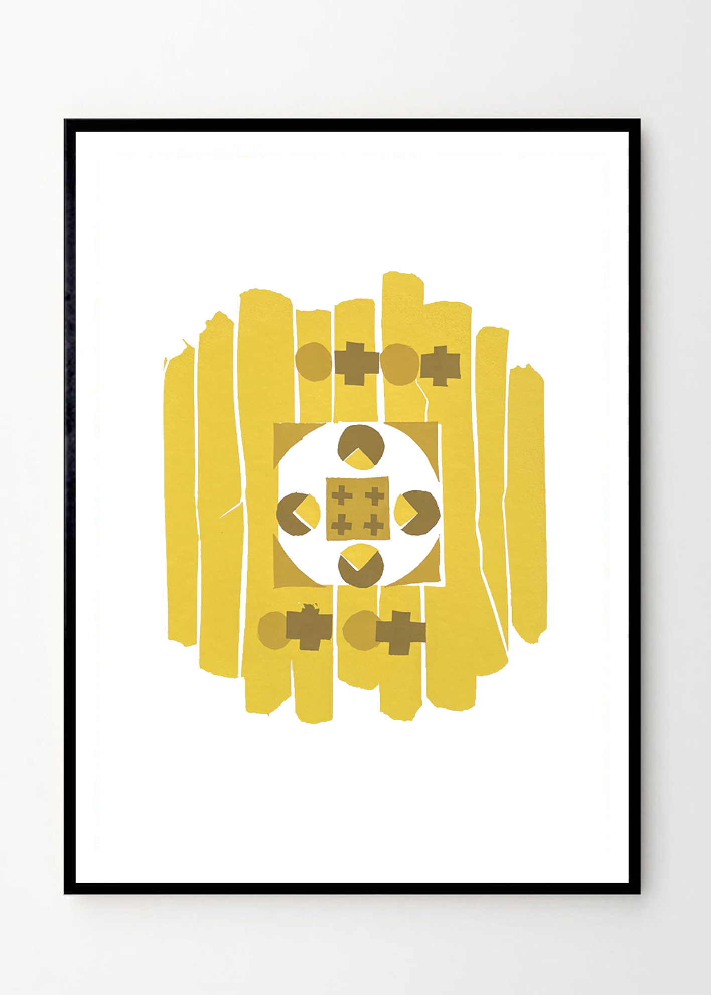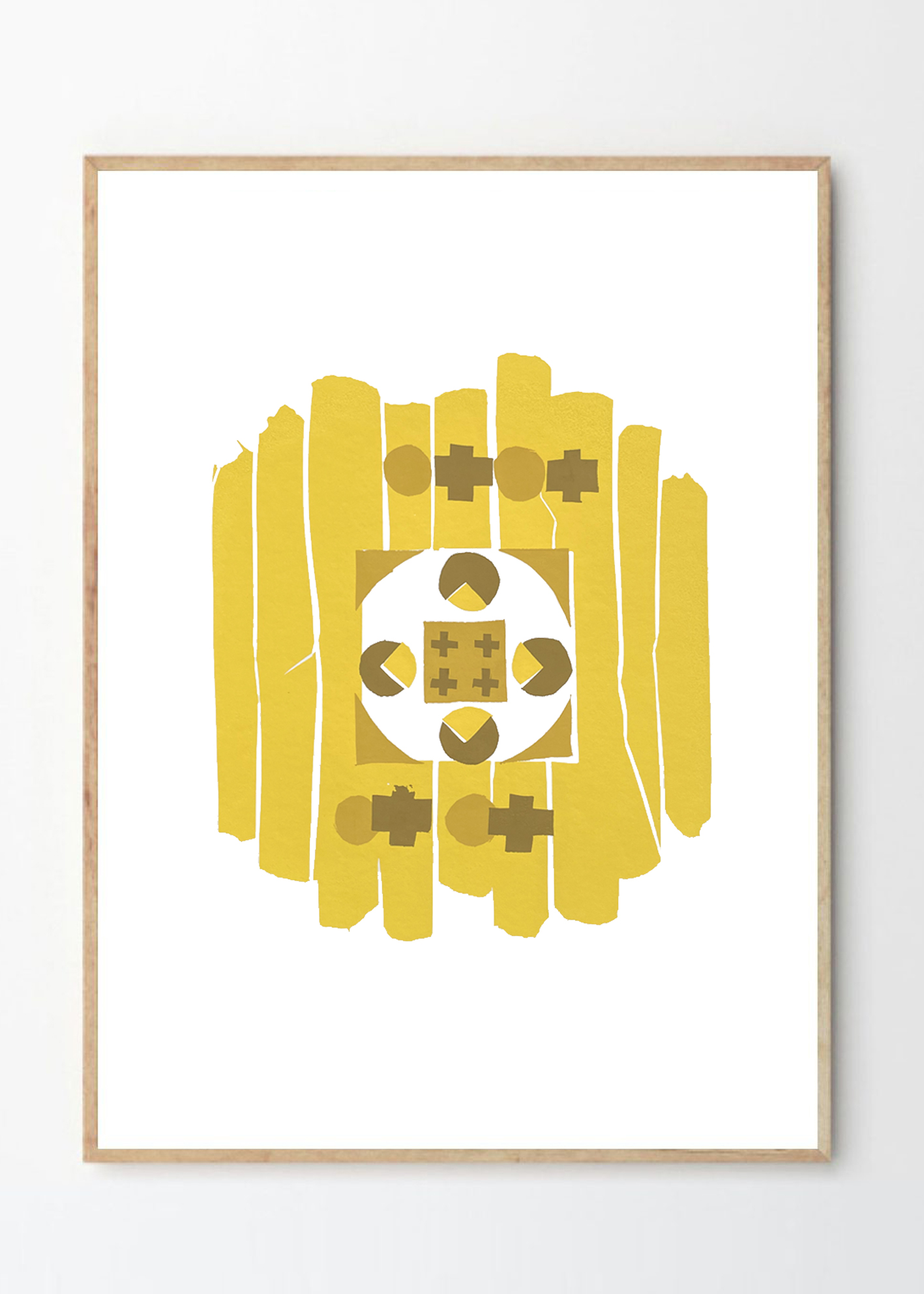 גיאומטריה סקנדינבית –  הדפס ידני מופשט בסגנון סקנדינבי בגוון צהוב חרדל.